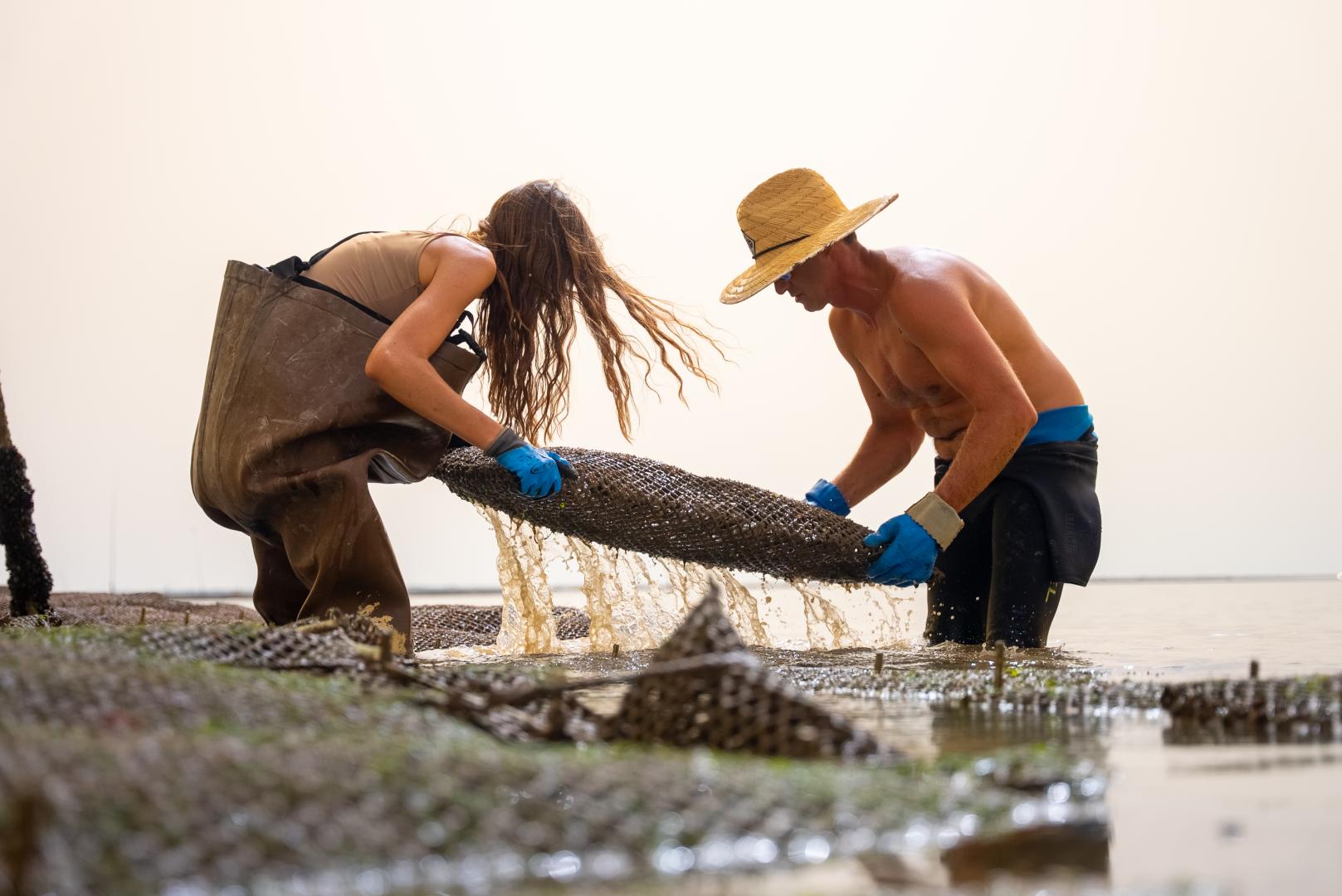 Danach kann man zum zweiten Schritt übergehen, dem Entkrusten, bei dem die Austern vorsichtig voneinander gelöst werden. Anschließend kann man sie wieder ins Meer zurückbringen, indem man sie in Taschen auf Tischen platziert. Fast zwei Jahre lang ernährt sich die Auster von Plankton und wächst so unter der Aufsicht des Austernzüchters heran. Während dieser Zeit müssen die Taschen je nach Gezeiten oder Strömungen fast vierzig Mal umgestellt werden. Der Austernzüchter muss jeden Tag über seine Parks wachen. Es ist ein harter und zugleich sehr präziser Beruf.