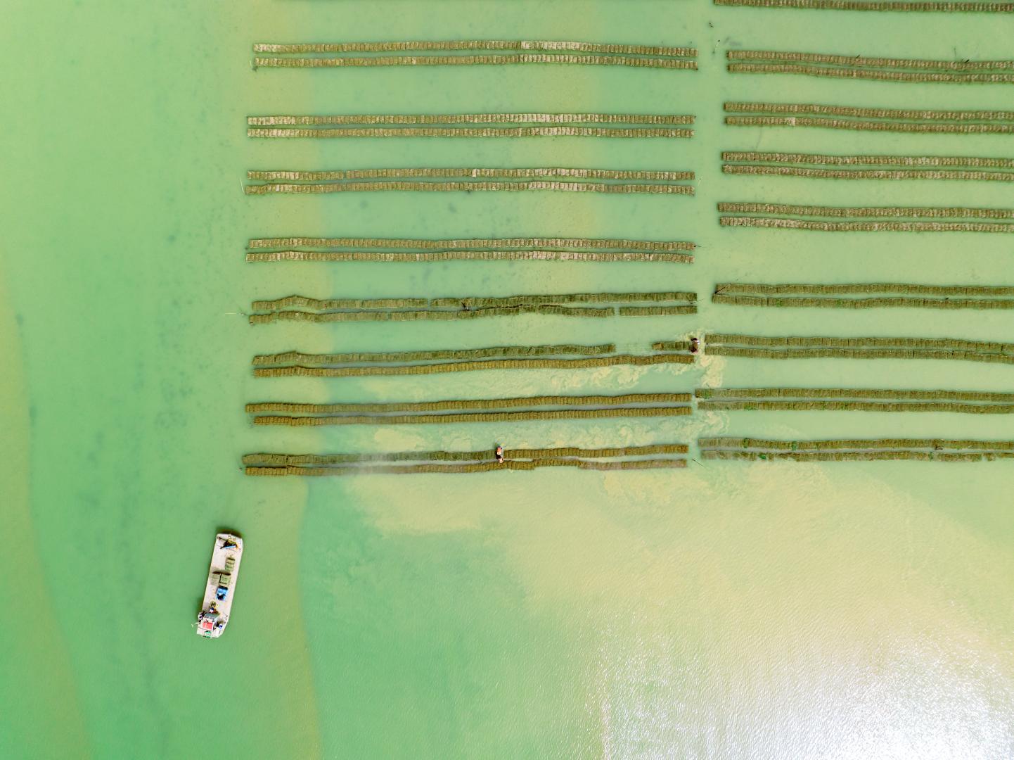 Die letzte Etappe ist für das Becken von Marennes-Oléron typisch: die Reifung in den Klärbecken. Die Claires sind ehemalige Salzgärten mit lehmigem Boden, in denen sich das Süßwasser bei jeder Flut mit dem Meerwasser vermischt. Die Austern reifen ein bis sechs Monate in den Claires. Das ist der Zeitpunkt, an dem die Magie einsetzt. Neben dem Eintauchen in eine besondere Umgebung kann sich die Auster vor allem von einer mikroskopisch kleinen Alge ernähren, der Blaualge. Das gelbe Fleisch der Auster wird durch den Kontakt mit dem Kahn grün und nimmt diese besondere Farbe und diesen einzigartigen Geschmack an, den man nur in einem Land findet, nämlich in Marennes Oléron!